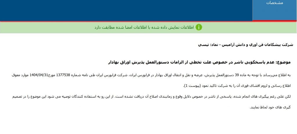 «به اطلاع میرساند با توجه به عدم رعایت ماده 39 دستورالعمل پذیرش، عرضه و نقل و انتقال اوراق بهادار در فرابورس ایران (عدم رعایت الزامات ماده 7 بند 3 دستورالعمل اجرایی افشای اطلاعات شرکتهای ثبت شده نزد سازمان فرابورس ایران) اقدام به اعطای فرصت 3 ماهه به ناشر (تا تاریخ 1404/07/30) جهت رعایت موارد فوق نموده است.»