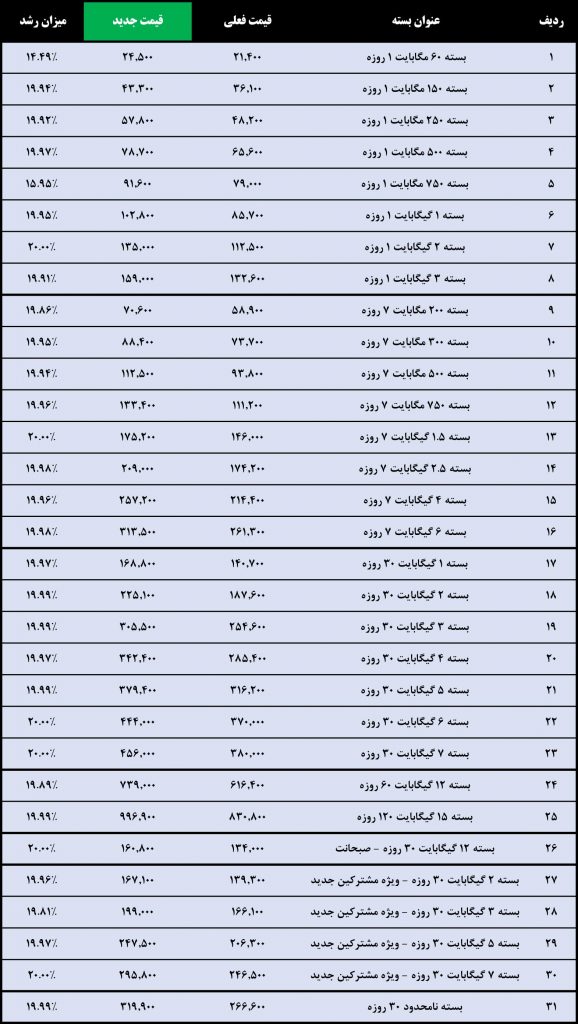 | ردیف | مدت زمان | حجم (گیگابایت) | قیمت قدیم (ریال) | قیمت جدید (ریال) | درصد تغییر |