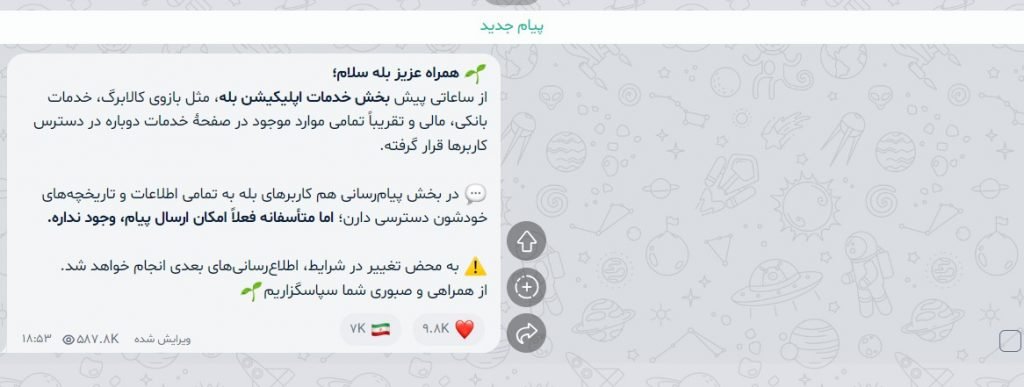 «بله» با انتشار پیامی در کانال رسمی خود، از سرگیری برخی از خدمات خود مانند کالابرگ، خدمات بانکی، مالی و... خبر داد. با این حال امکان ارسال پیام در این پیامرسان همچنان وجود ندارد.