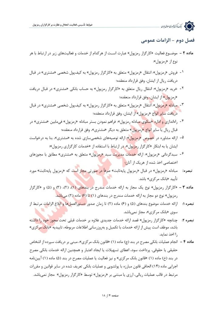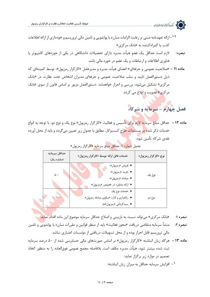 متن کامل پیشنویس مستند «ضوابط تأسیس، فعالیت، انحلال و نظارت بر کارگزاران رمزپول» را میتوانید از اینجا مشاهده کنید.