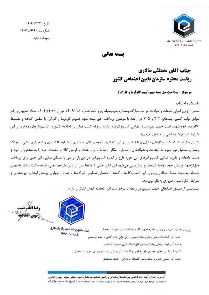 اتحادیه کسبوکارهای مجازی در این نامه با استناد به مصوبات مرتبط با تسهیل فضای کسبوکار، خواستار آن شده که امکان بهرهمندی این کسبوکارها از تنفس سه ماهه و تقسیط ۳۶ماهه پرداخت حق بیمه فراهم شود.