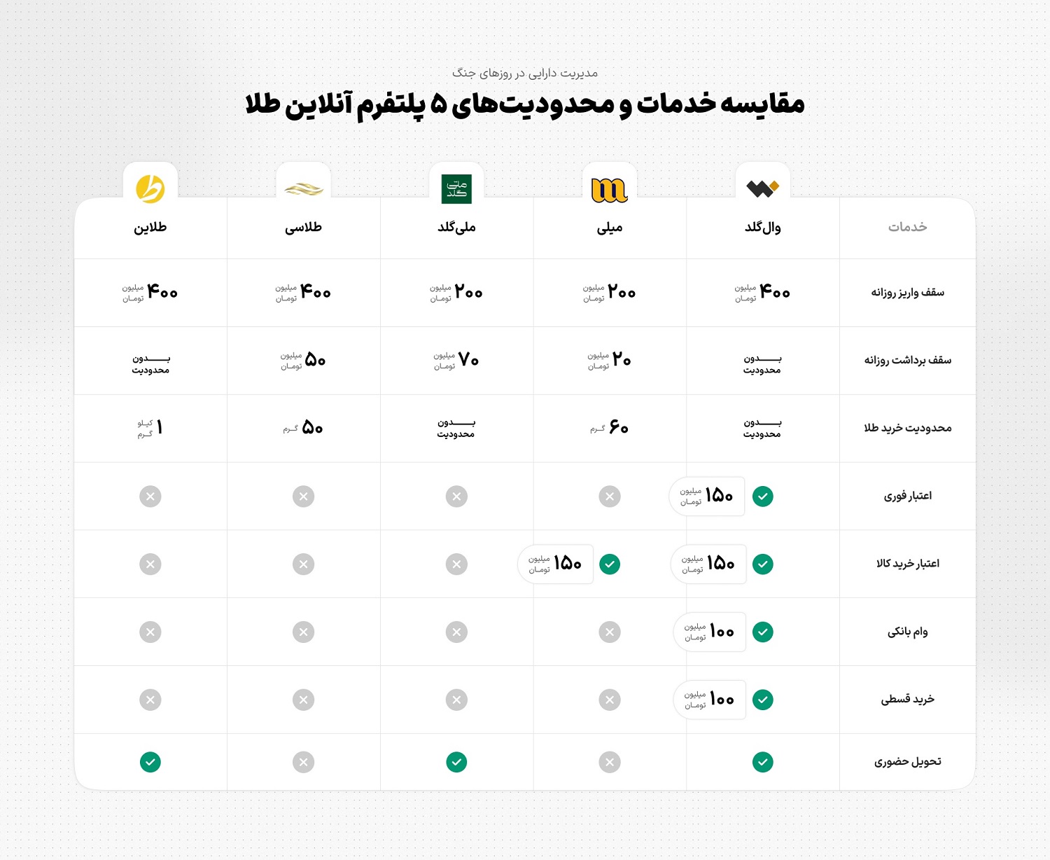 لازم به ذکر است دادههایی از قبیل سقف واریز و برداشت روزانه، محدودیت خرید طلا یا تحویل حضوری مربوط به شرایط جنگی اخیر است و در شرایط عادی نباید به دادههای این جدول استناد کنید.