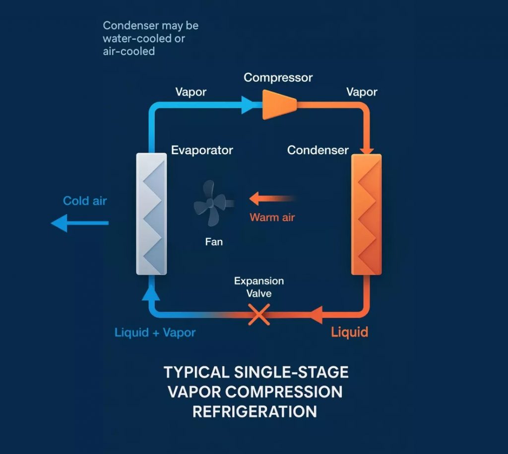 در این سیستمها، یک مبرد ویژه در یک چرخه بسته حرکت میکند: ابتدا بهصورت بخار وارد کمپرسور میشود، فشرده میگردد، سپس به مایع تبدیل میشود، بعد منبسط میشود و دوباره تبخیر شده و به بخار بازمیگردد. این چرخه بهطور مداوم تکرار میشود و در هر مرحله، گرما جابهجا میشود. هرچند کمپرسور به انرژی نیاز دارد، اما چنین سیستمی میتواند دما را بهمراتب پایینتر از دمای محیط کاهش دهد. به همین دلیل است که مراکز داده و ساختمانها حتی در گرمترین روزهای تابستان هم خنک میمانند.