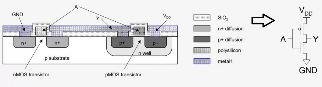 برای درک بهتر، تصور کنید دو ترانزیستور کنار هم یک گیت منطقی NOT را تشکیل میدهند. در این ساختار، ترانزیستور nMOS در پایین زمانی جریان را عبور میدهد که روشن باشد و ترانزیستور pMOS در بالا زمانی جریان را عبور میدهد که خاموش باشد.