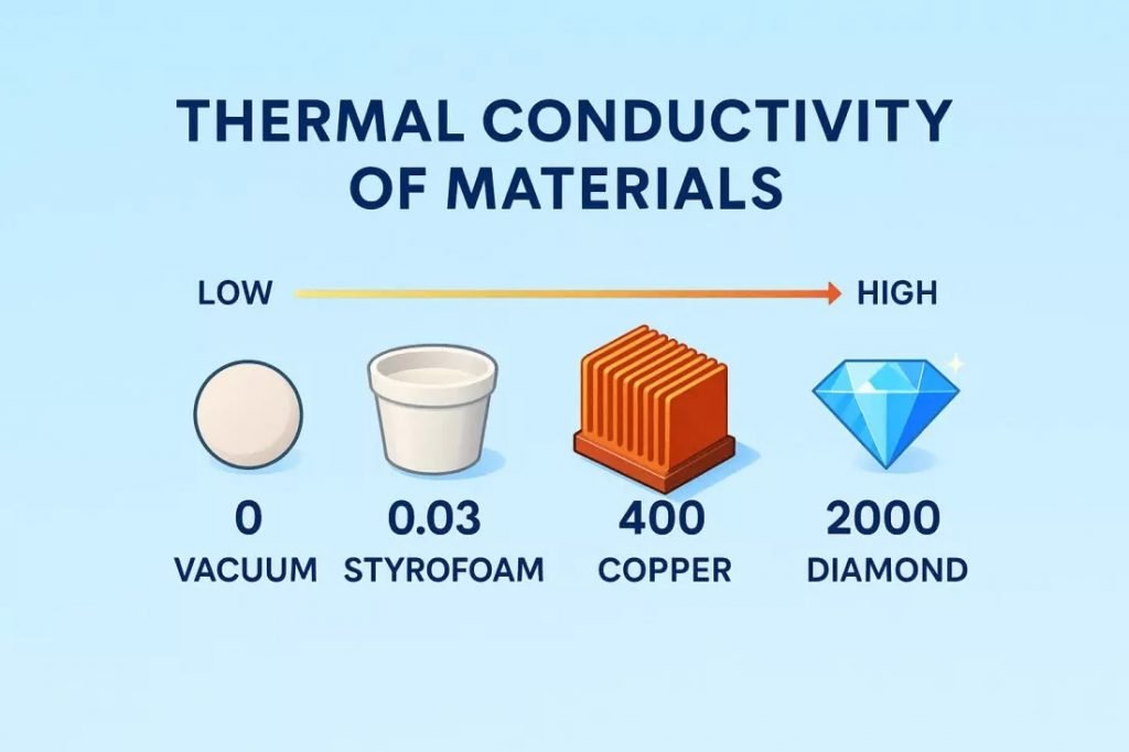سرعت این انتقال گرما به ویژگی مهمی به نام رسانایی حرارتی بستگی دارد. رسانایی حرارتی نشان میدهد یک ماده تا چه اندازه توانایی انتقال گرما را دارد. برای مثال، عایقی مثل یونولیت رسانایی حرارتی بسیار پایینی دارد. در مقابل، فلزی مانند مس رسانایی حرارتی بسیار بالایی دارد. در دو سر طیف، خلأ کامل قرار دارد که رسانایی حرارتی آن عملاً صفر است و در سوی دیگر، الماس که بالاترین رسانایی حرارتی شناختهشده را دارد و عدد آن از ۲۰۰۰ هم فراتر میرود.